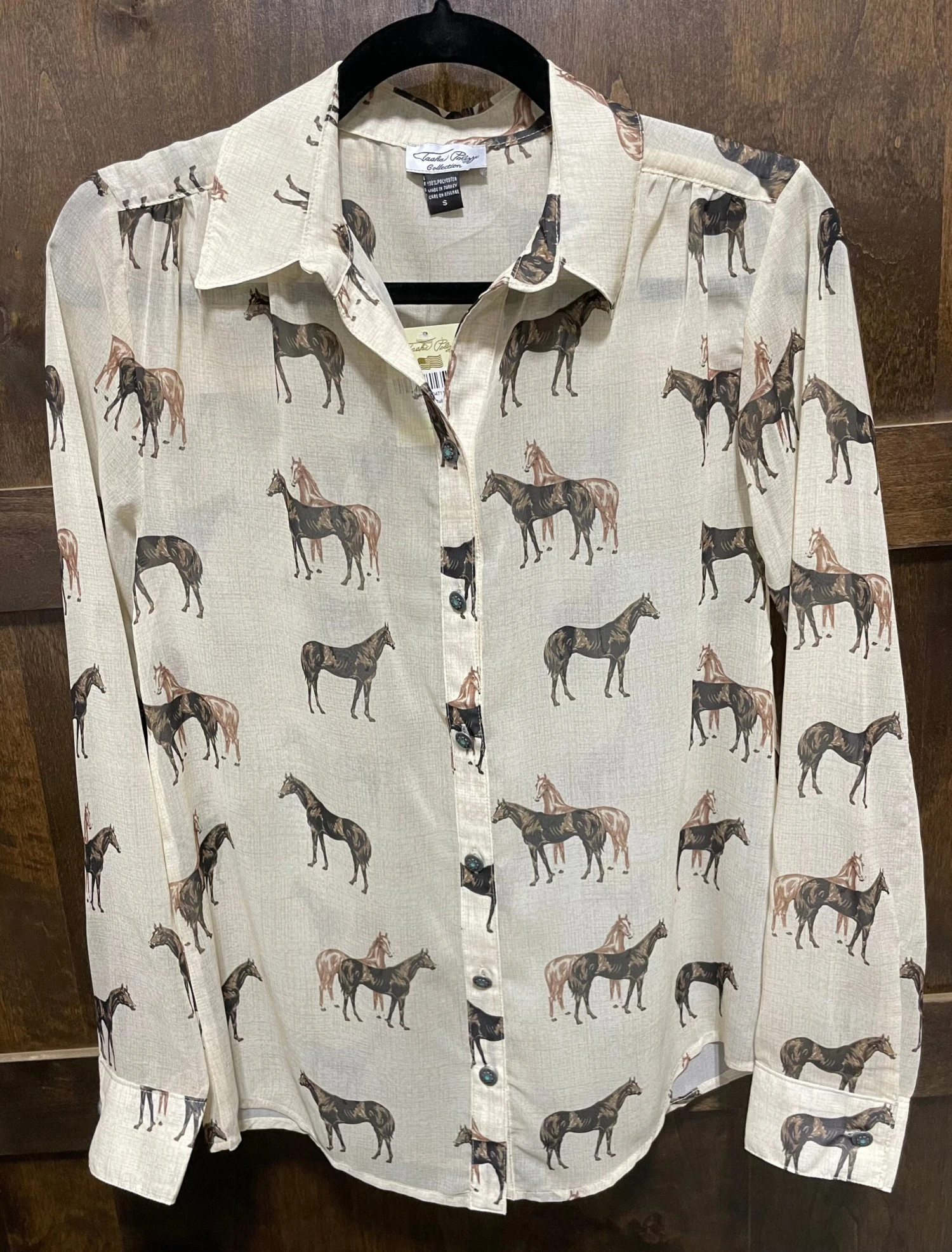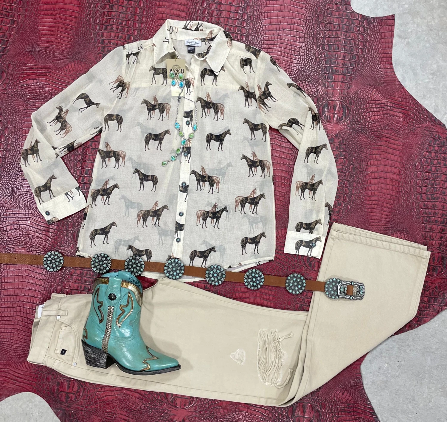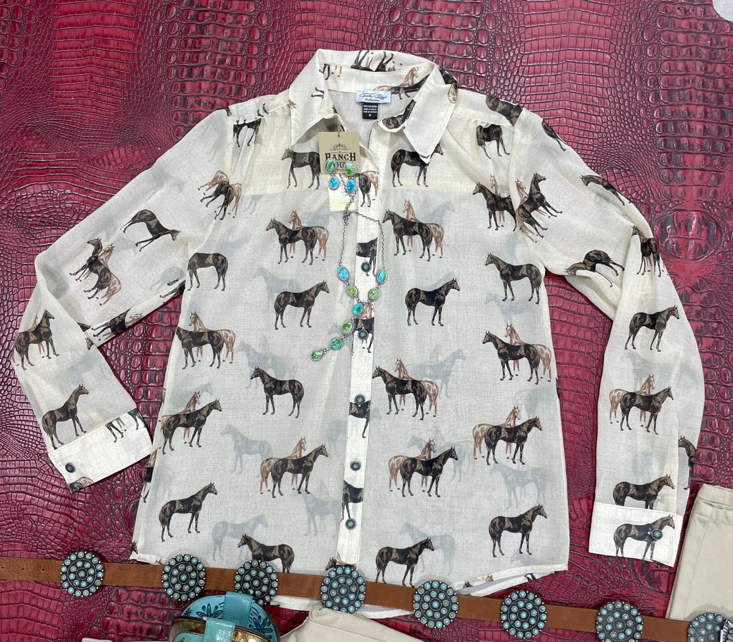 Perfect lightweight, sheer shirt for layering. Features a beautiful horse pattern, collar, small silver and turquoise buttons to front and cuff. Just delightful!