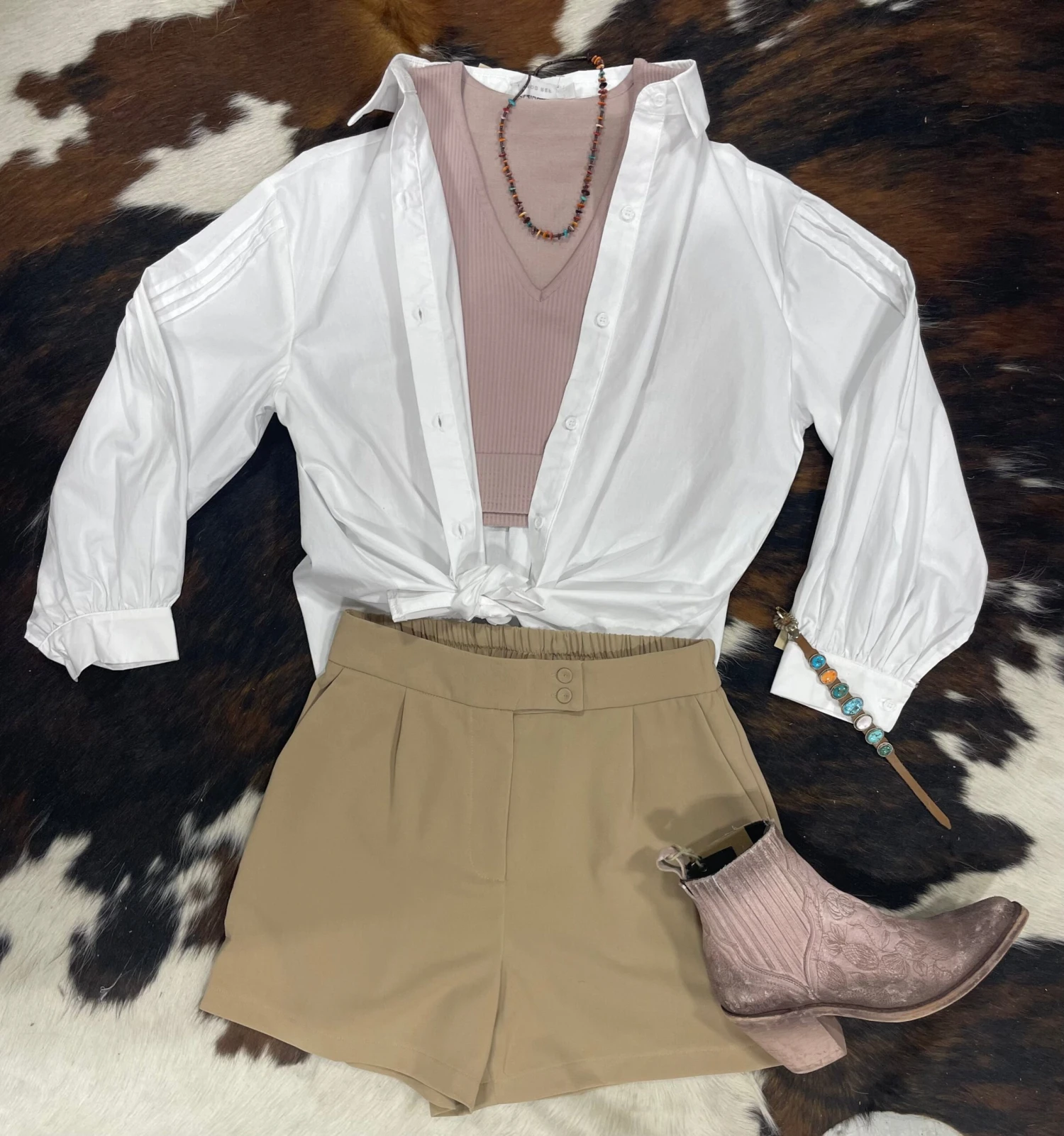 Looking for that perfect pair of shorts that you can dress up or go casual? Well, here ya go! These khaki shorts are so darling! We love the stretchy back elastic waistband (go ahead and eat the cake, you deserve it!) These cuties feature double front buttons, pleats, elastic to back waistband and pockets.
