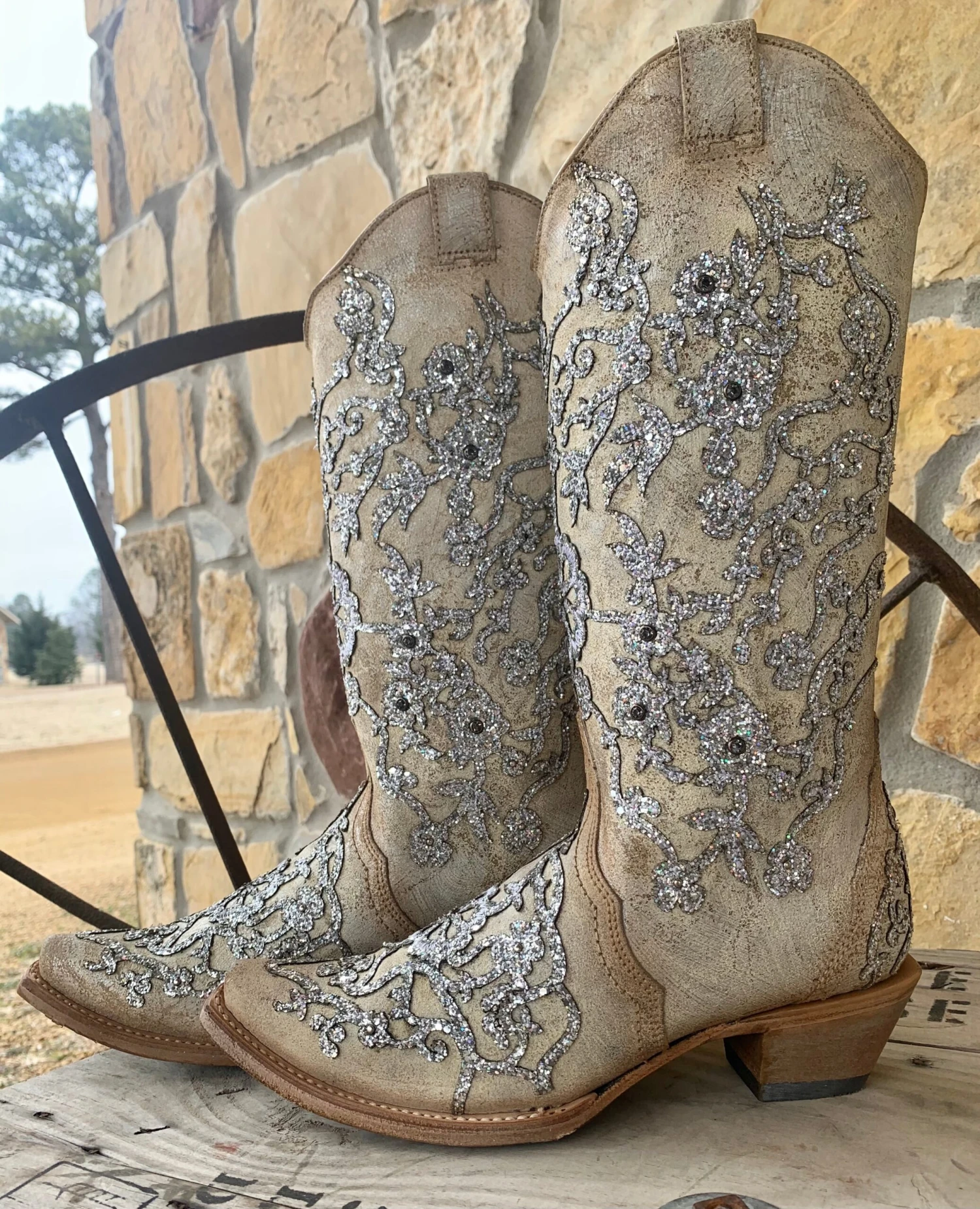 There will never be a reason to cry while wearing these Flower Happy Boots by Corral. These boots are a vintage cream underlay with silver glitter flowers and studs throughout.Â