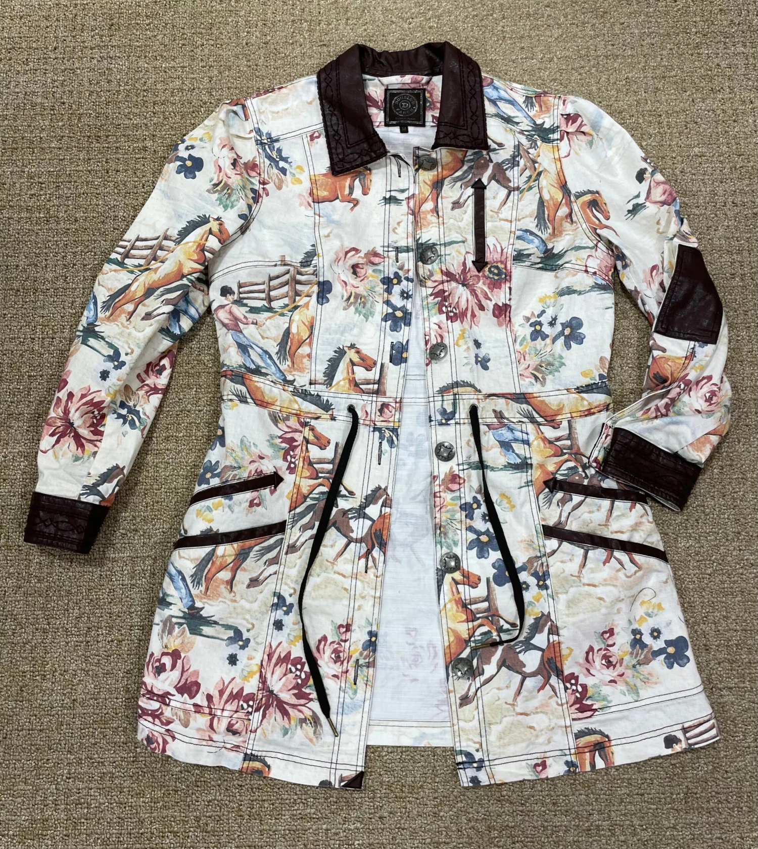 You’re gonna go WILD over this adorable jacket/dress! The wild flowers and wild horses are just darling! Chocolate brown leather to collar, cuffs and pockets. Silver buttons and drawstring waist. Wear this as a jacket or as a dress!Â