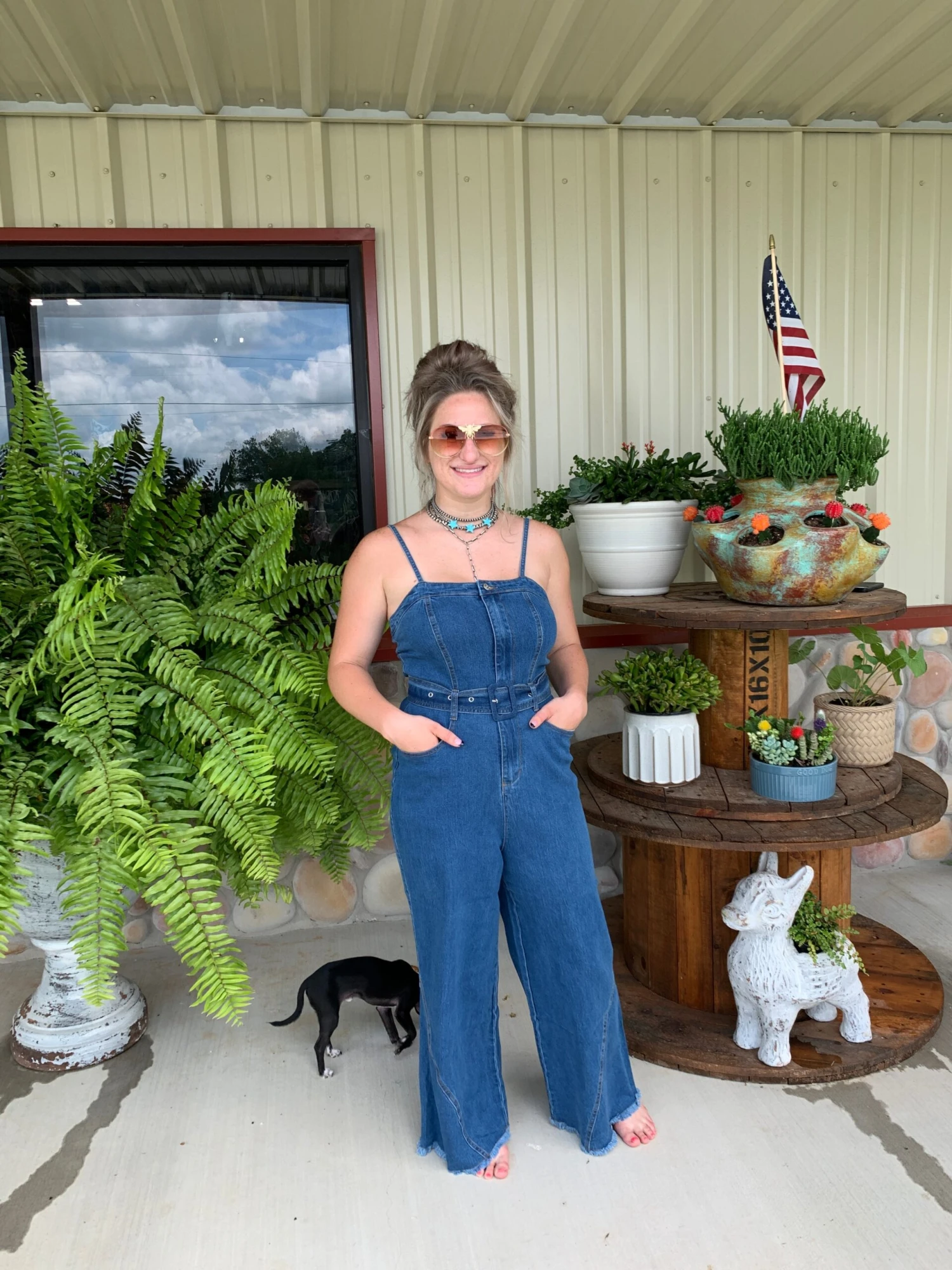 Description: SOLID WASHED DENIM SLEEVELESS CROPPED FRINGE HEM BOOT CUT JUMPSUIT WITH BELT.