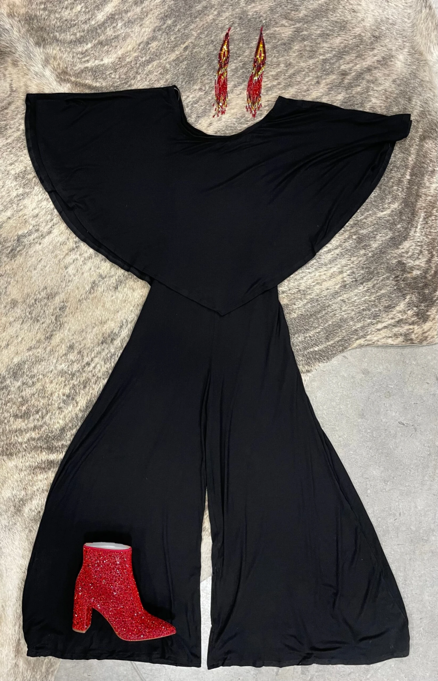 We are so in love with our new off shoulder jumpsuit. Super comfy and stretchy. Â This sexy jumpsuit features a large V ruffle to from and back, pockets and is wide leg. Can be worn exposing both shoulders or just one.Â