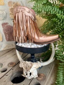 New from Old Gringo, these booties feature metallic gold and bone leather. She’s accented with a heart, fringe, and beautiful stitching detail. The silhouette is so sassy, boasting a higher heel and easy zippers. It’s time to live your fantasies in these beautiful, sassy booties!