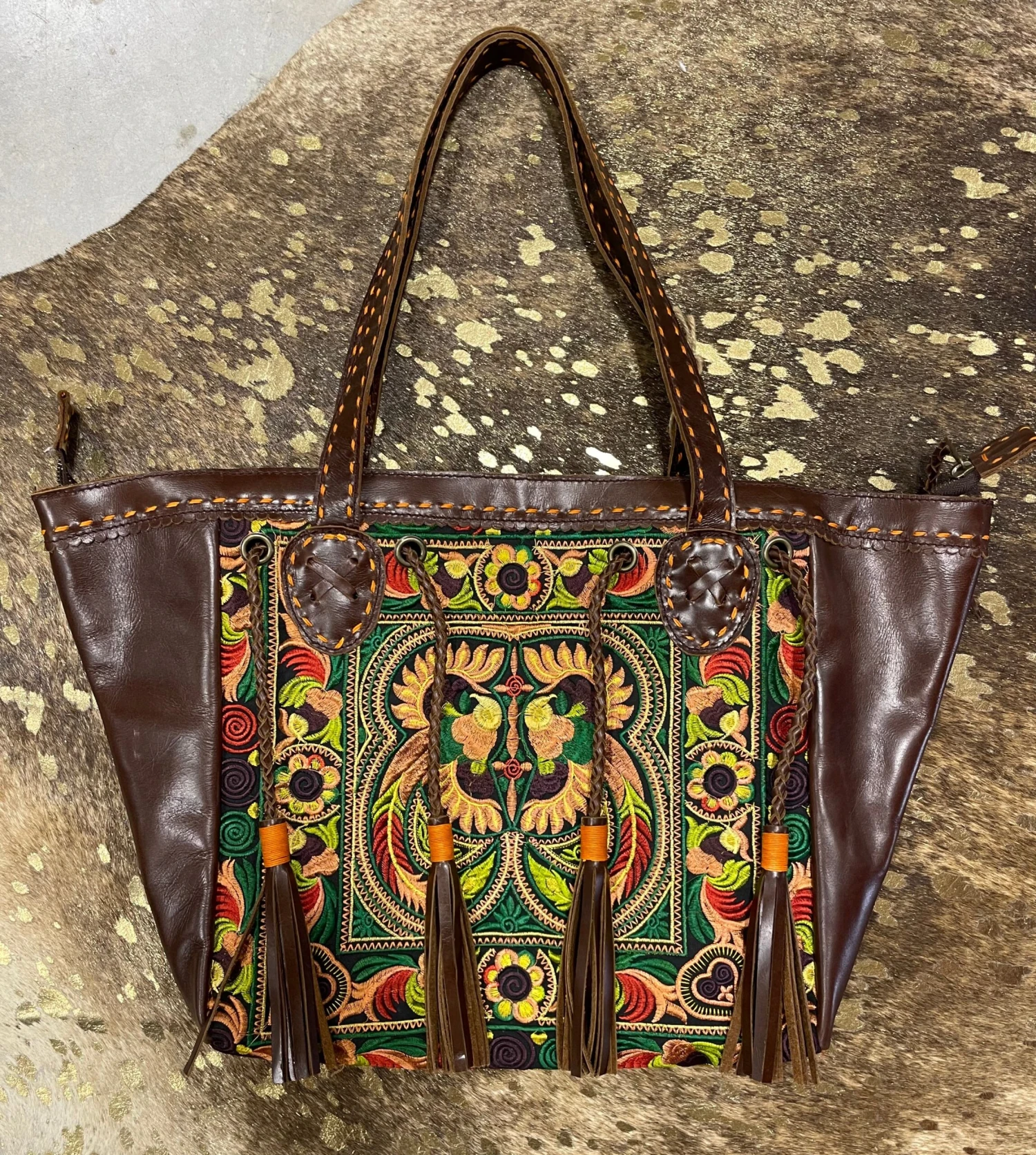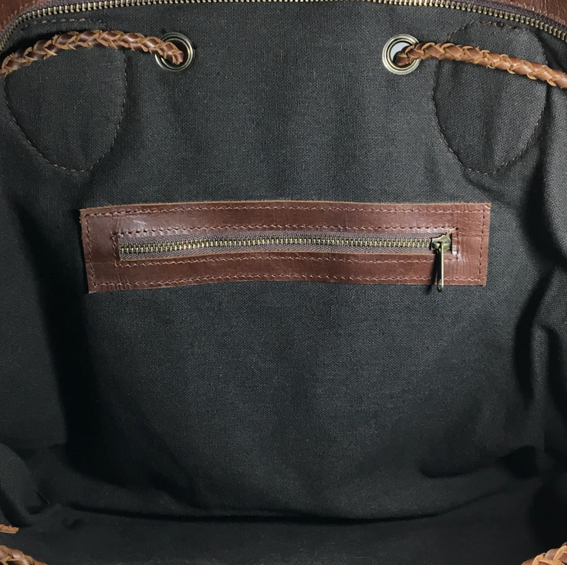 The soft leather only gets better with age. Our hand-sewn embroidery is paired with black pinstriped hemp fabric with leather accents. Interior pockets help keep you organized and your phone and keys easily accessible.
