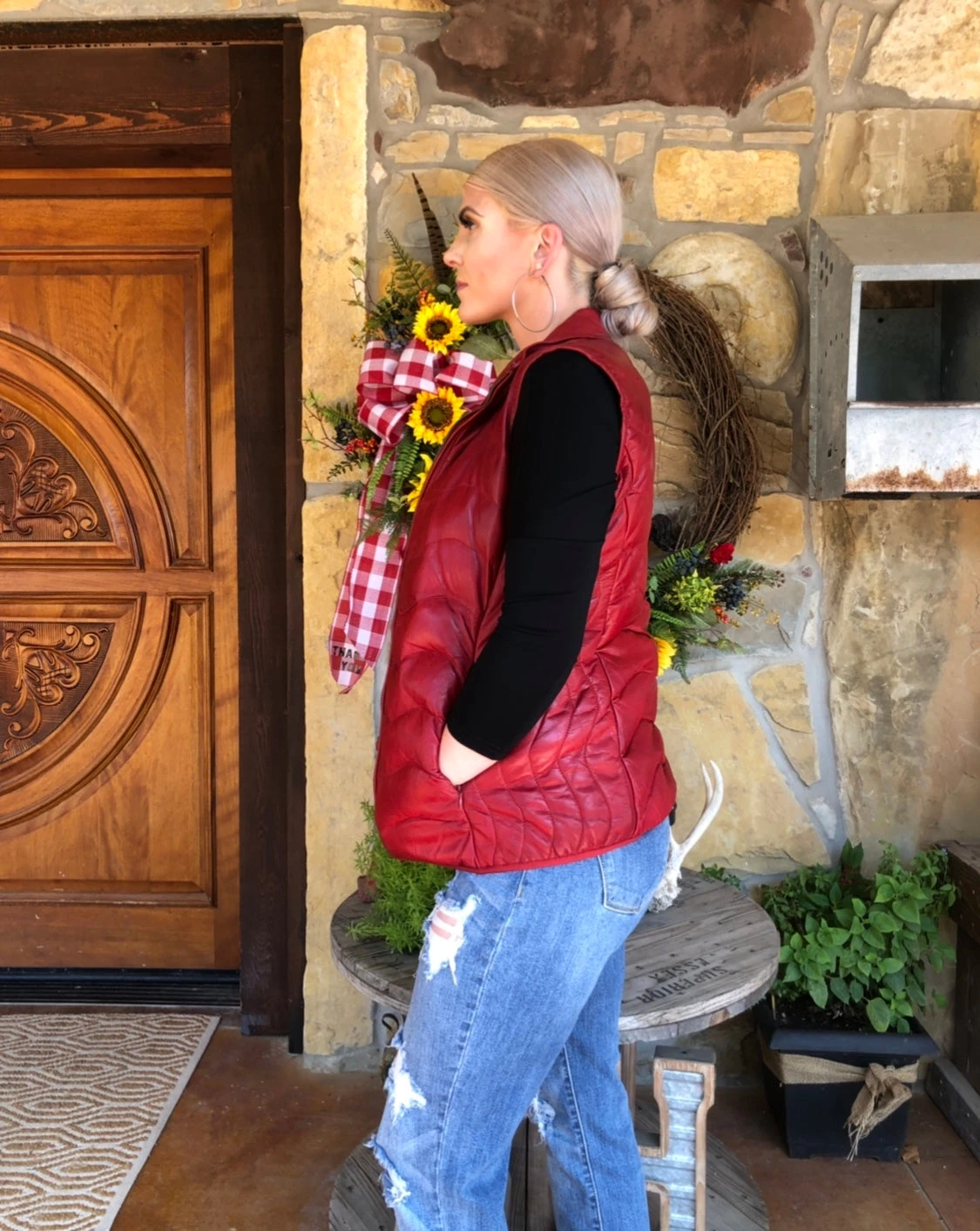 Oh my this red, lamb skin, down filled vest is everything. Zips up the front and has an inside pocket. It has a stand up collar with 2 side entry pockets.