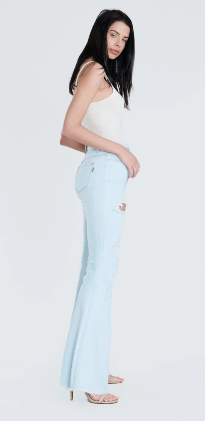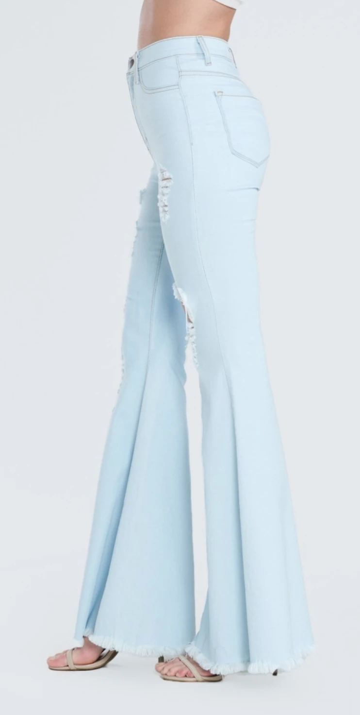 Take a trip back to the 70’s in these amazing bell bottoms. They feature a super light wash with camel stitching, complete with the perfect amount of distress. Super stretchy and fit is true to size.